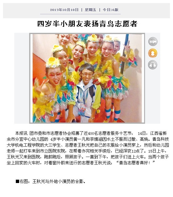 11月13日上午,太阳成tyc7111cc分团委收到一封来自青岛港中旅(山东)旅行社有限公司的感谢信,信中表达了对我院学生机自114班任建桥同学服务第十届中国艺术节的感谢。