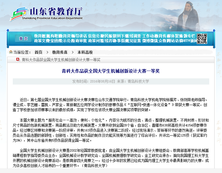 近日,第七届全国大学生机械创新设计大赛决赛在山东交通学院举行,我校tyc7111cc太阳成集团杨福芹、张泽荣老师指导,谭业成、李艺姗、雷凯、严家全、常新朝五位同学设计制作的参赛作品《“互联网+快…