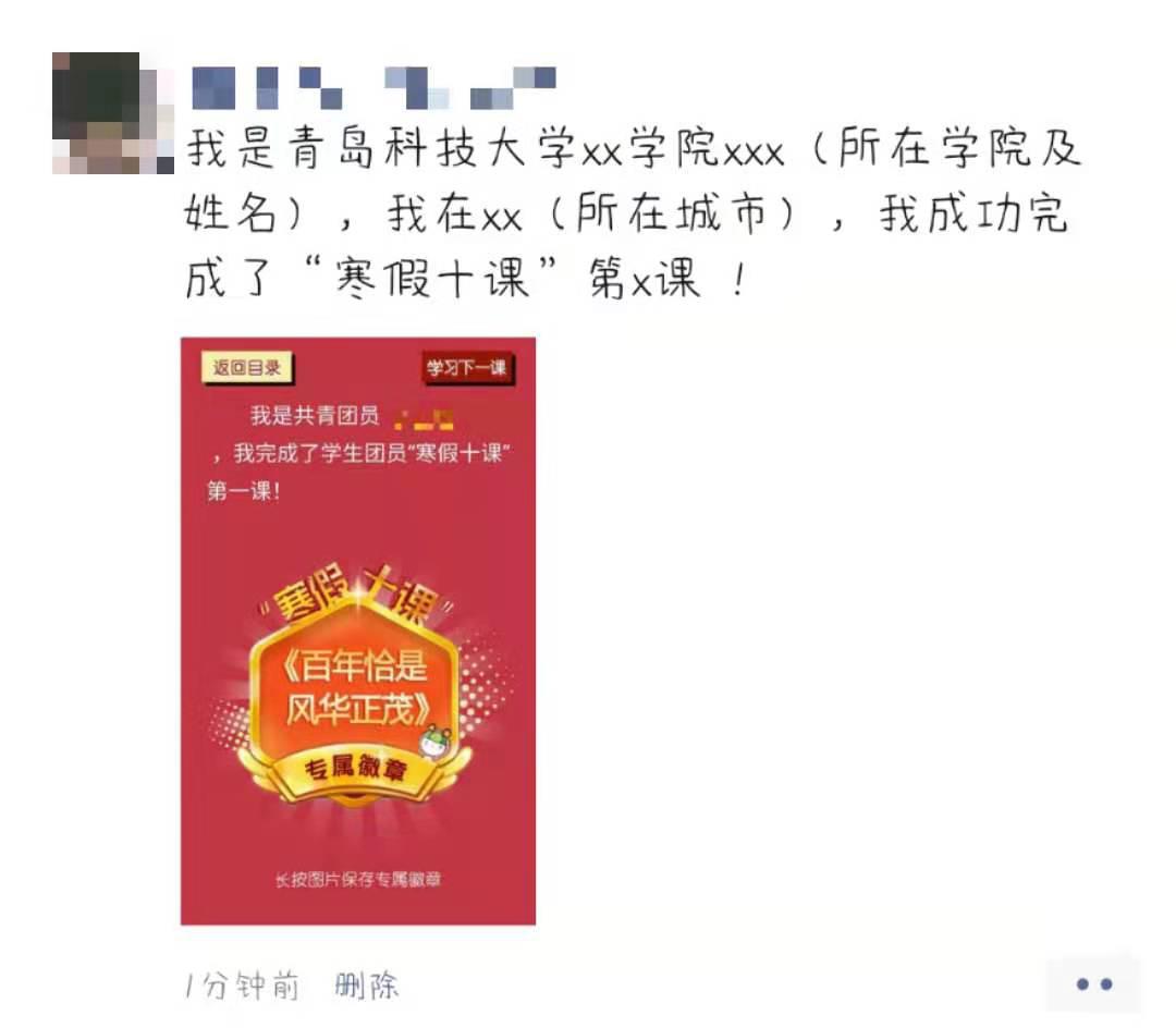 1、建议各团支部鼓励团员微信朋友圈截图,具体内容为“我是太阳成tyc7111ccxx学院xxx(所在学院及姓名),我在xx(所在城市),我成功完成了“寒假十课”第x课!”,详情请见下图