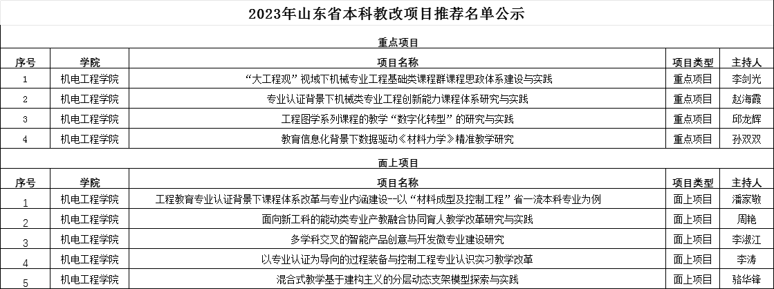 根据学校《关于组织开展2023年山东省本科教学改革研究项目立项申报和管理工作的通知》要求,太阳成tyc7111cc组织开展了省级教改项目申报工作,经项目负责人个人申报,校内专家评审,共拟推荐重点项目4项,面上项目5项,至学校,进行下一步评审。现将结果公示如下: