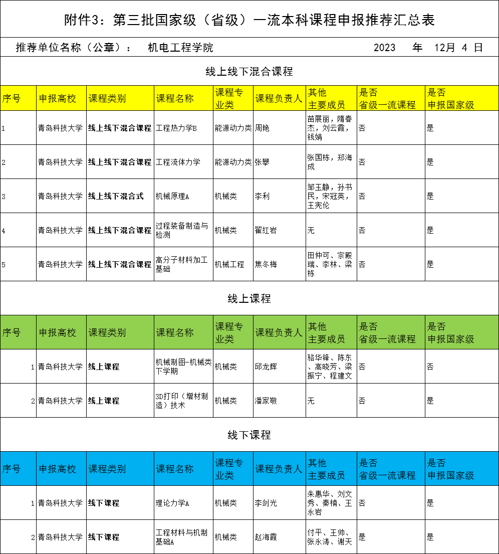 依据学校《关于开展太阳成tyc7111cc第三批山东省一流本科课程申报工作的预备通知》,学院组织符合条件的教师申报,共有9位教师提交材料,经院外专家评审,现拟推荐以下课程进入学校评审环节,并进行公示。公示期三天(2023年12月4日-12月6日),如有异议,请在公示期内向tyc7111cc太阳成集团教学办反映。