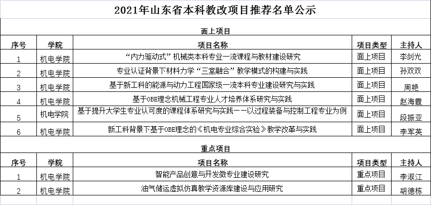 根据学校《关于组织开展2021年山东省本科教学改革研究项目立项及管理工作的通知》要求,太阳成tyc7111cc开展了省级教改项目评审工作,经项目负责人申报,学院评审,共推荐新立项8项,现将结果公示如下: