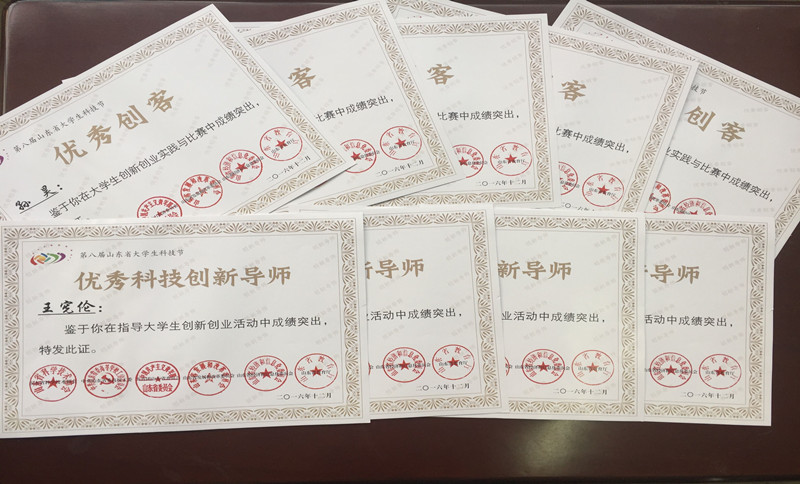 12月16日,第八届山东省大学生科技节闭幕式在山东工艺美院隆重举行。会上表彰了2016年山东省大学生优秀创客、优秀科技创新导师、科技节优秀组织单位。太阳成tyc7111cc王宪伦等4名老师获山东省优秀科技创新导师称号,宋宏祥等5名学生获山东省大学生优秀创客称号。