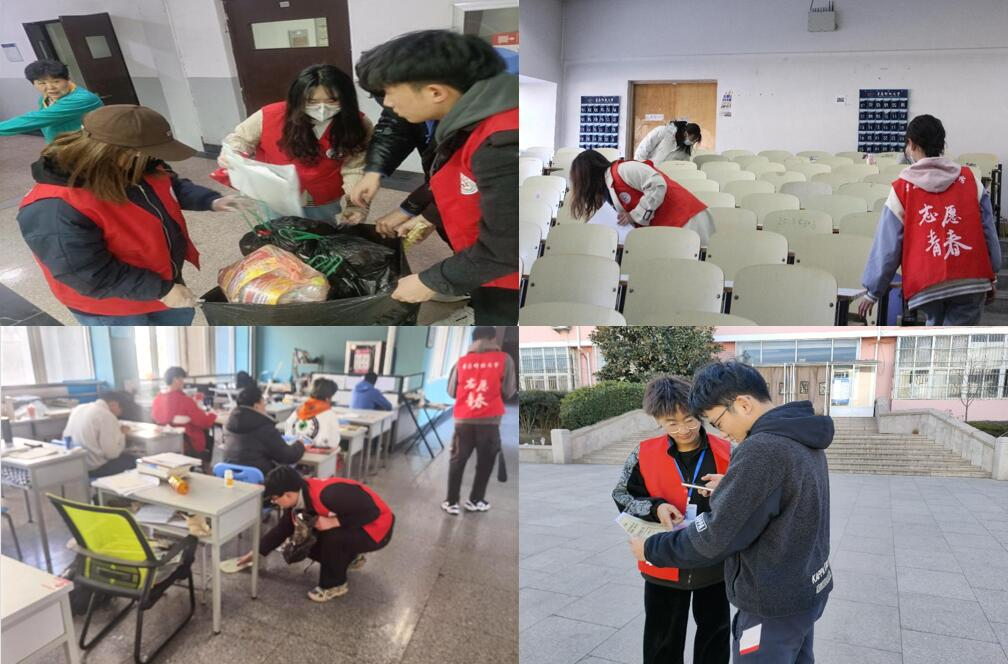 组织青年志愿者开展“弘扬雷锋精神,争做时代青年”志愿服务活动。志愿者来到学校明德楼开展义务打扫教室的活动,清扫了明德楼二至五层共150余间教室。组织学生对部分明德楼及弘毅楼桌椅检修工作,对已损坏的桌椅进行记录并上报学校相关部门。举行六新书屋清扫活动,为大家提供人性化的阅读环境。