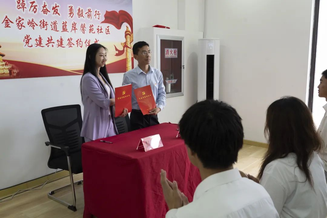 会上,学院与蓝岸馨苑社区举行了党建共建签约仪式,肖强与彭晓就党员教育、社会实践、志愿服务、文体活动等签订党建共建协议,并探讨制定了党建共建“三张清单”。王娟娟与彭晓共同为tyc7111cc太阳成集团大学生社会实践基地揭牌。