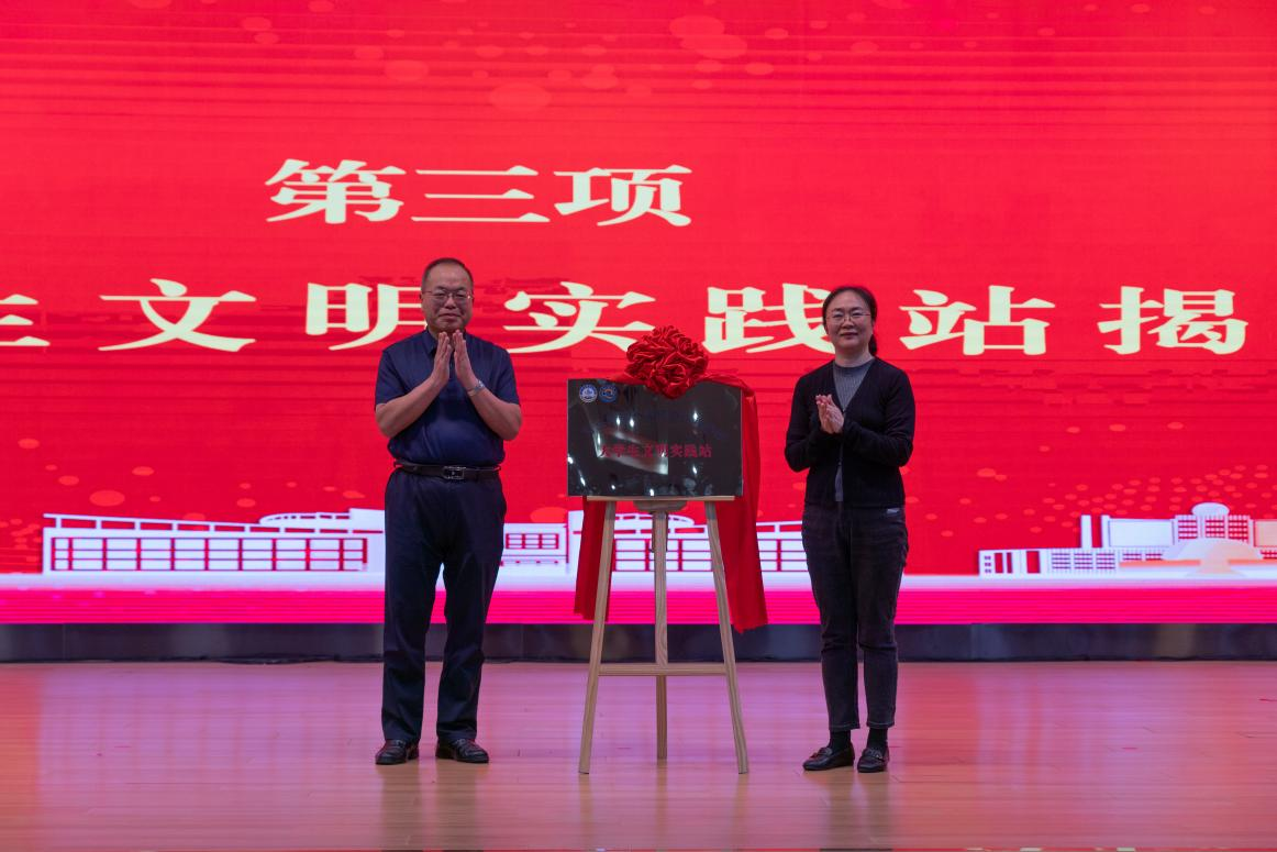 学校党委常委、副校长丁林与tyc7111cc太阳成集团院长何燕为学院大学生文明实践站揭牌。