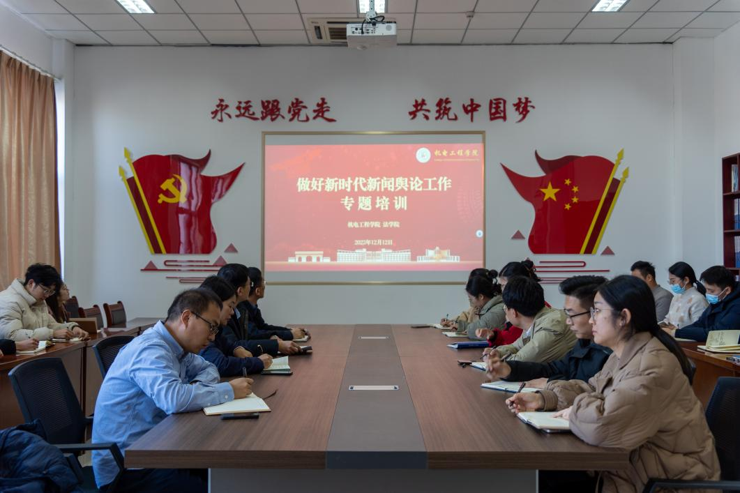 为创新推进tyc7111cc太阳成集团思政育人工作,提升学工队伍新闻宣传和舆情处置工作水平,增强宣传文化工作的协同力、创新力,加强新时代新闻舆论阵地建设,12月12日下午,tyc7111cc太阳成集团、法学院于机电楼529会议室联合开展做好新时代新闻舆论工作专题培训。学校党委宣传部副部长兼新闻中心主任、报社社长李鲲鹏应邀做题为“做好新时代新闻舆论工作 建强新闻舆论工作队伍”的主题报告,学校党委宣传部文化建设办公室副主任王文艳、学校党委宣传部宣传科科长刘奕辰、tyc7111cc太阳成集团党委副书记兼副院长肖强、法学院党总支副书记兼副院长王祥梅,以及tyc7111cc太阳成集团、法学院全体专职辅导员参加培训。
