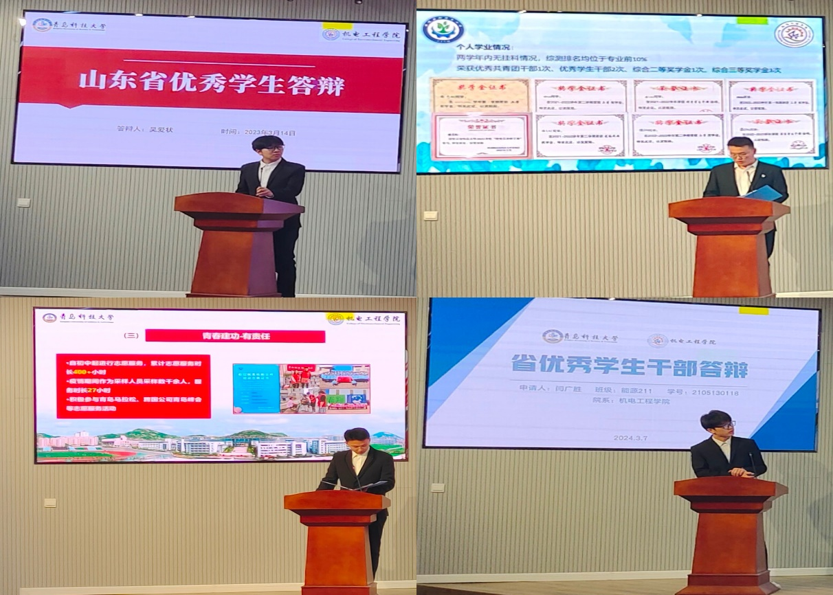 经个人申请、资格审查,共有23名山东省优秀学生候选人和6名山东省优秀学生干部候选人参加评选。答辩过程中,候选人充分依托自身特长,从思想启迪、个人发展、职务担当、科技创新、学术钻研、实践历练、荣誉成就等多个维度,全面展现了他们在大学期间的拼搏进取之路。他们以实际行动彰显了机电学子勤奋刻苦、奋发向上、敢于突破的精神风貌,为全体同学树立了学习榜样,发挥了优秀学生、优秀学生干部的示范引领作用。答辩评审严格遵守评选规则,评审流程规范有序,评审过程严谨细致,最终确定3名学生干部作为山东省优秀学生干部候选人,6名学生作为山东省优秀学生候选人。