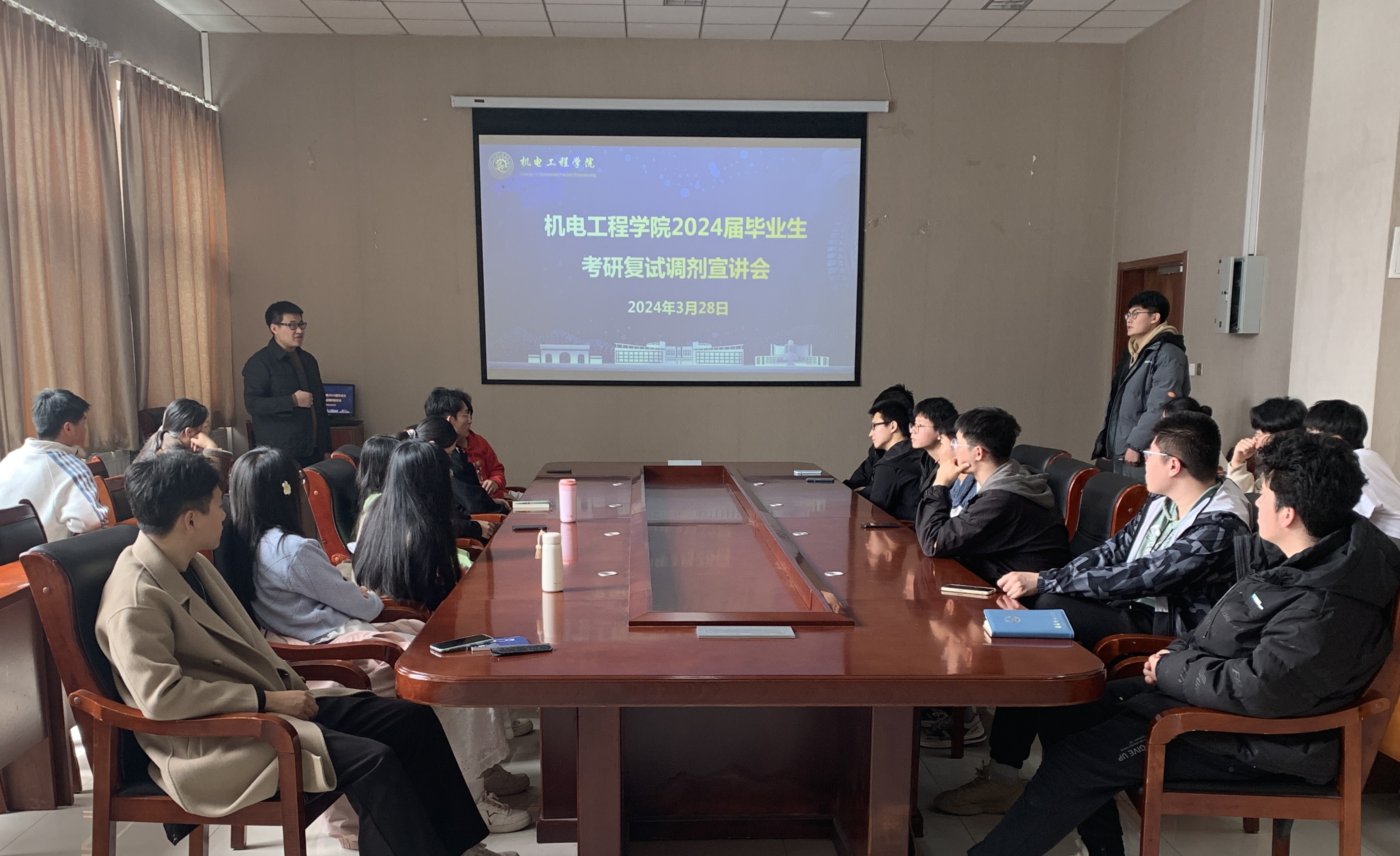 3月28日,tyc7111cc太阳成集团2024届毕业生考研复试调剂宣讲会在机电楼518会议室举办。副院长刘治明参加会议并进行复试调剂指导,毕业班辅导员、2024届考研学生代表参加宣讲会。