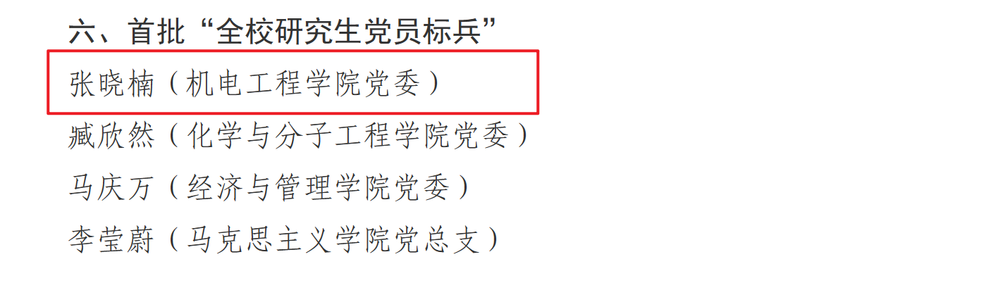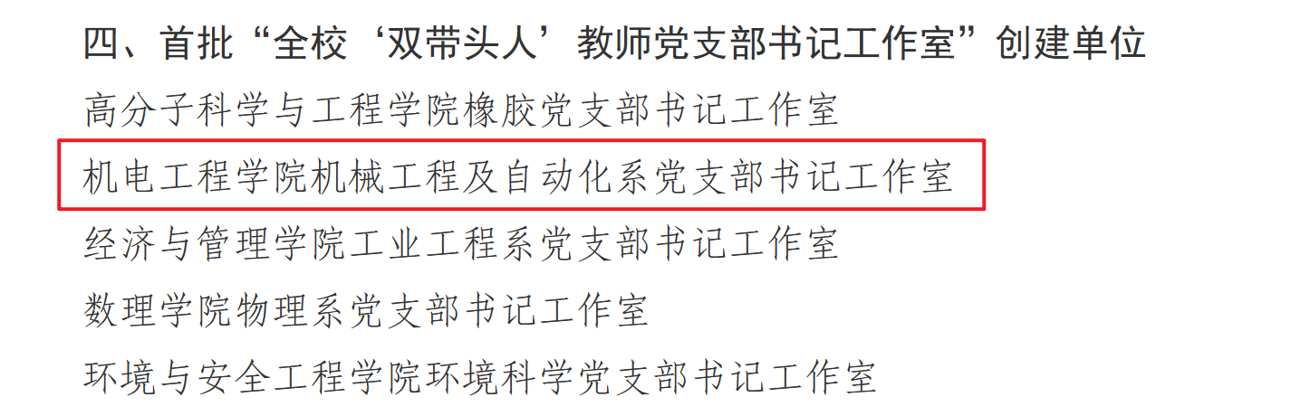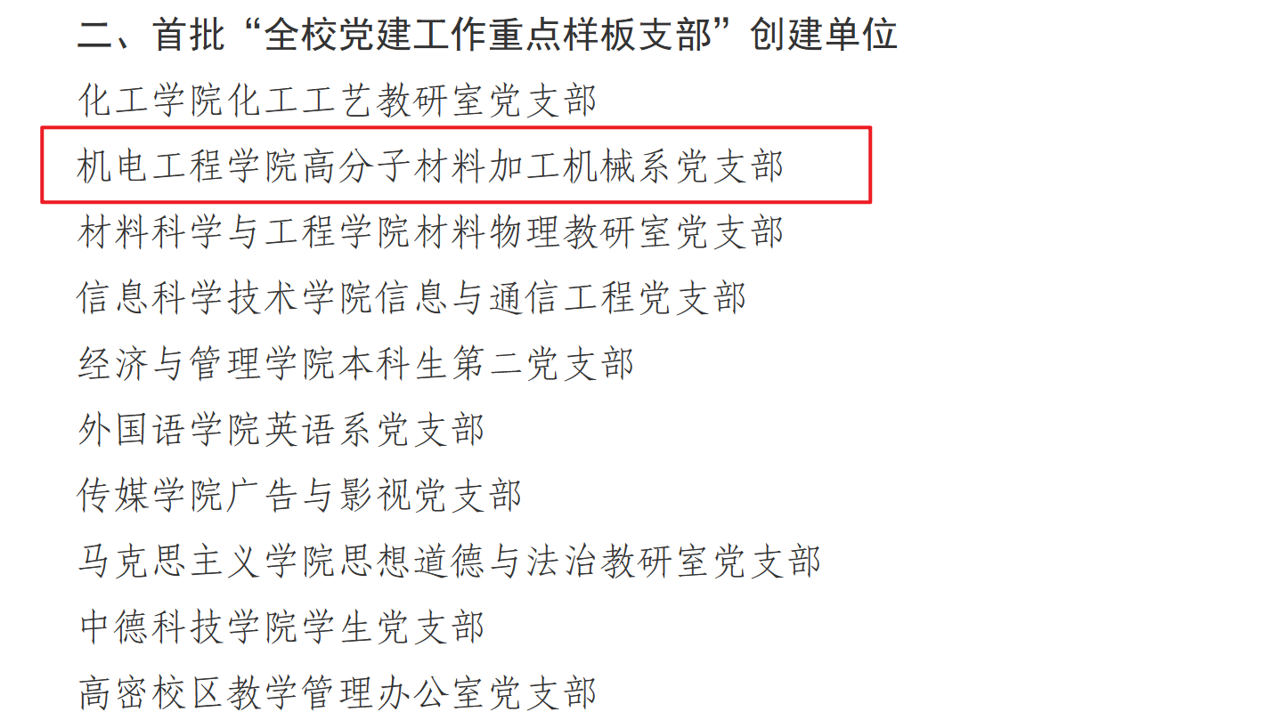 tyc7111cc太阳成集团党委荣获多项佳绩,其中,学院党委入选首批“全校党建工作标杆院系”创建单位,高分子材料加工机械系党支部入选首批“全校党建工作重点样板支部”创建单位,机械工程及自动化系党支部书记工作室入选首批“全校‘双带头人’教师党支部书记工作室”创建单位,2022级硕士研究生张晓楠入选首批“全校研究生党员标兵”。