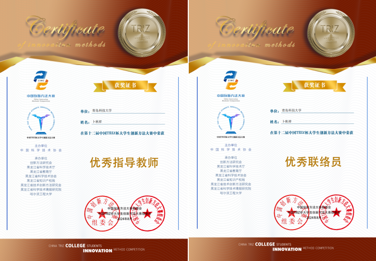 青科TRIZ协会以“方法引领·学以致用·课赛融合”为社团发展宗旨,依托山东省一流本科课程“创新方法与创新设计”开展三级课堂的课后实践课堂,在项目申报书、答辩PPT、作品实物和成果转化方面组织了五次集训活动,通过此次TRIZ杯大赛迁移实现了我校学生创新方法科技竞赛成果的又一次提升。