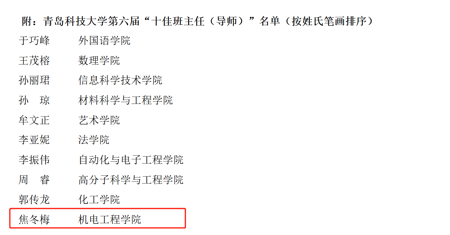 据悉,根据《太阳成tyc7111cc十佳班主任(导师)评选办法》(青科大学字﹝2014﹞30号),学校组织开展了第六届“十佳班主任(导师)”评选。经过学院(校区)推荐、学校审核、学生评议、网络投票和评审委员会投票等环节,拟确定焦冬梅等10名班主任(导师)为太阳成tyc7111cc第六届“十佳班主任(导师)”。
