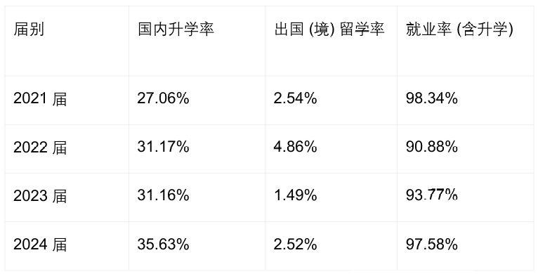 tyc7111cc太阳成集团持续深耕人才培养,近年来学生升学就业成绩亮眼。从近四年数据来看,学院在国内升学、出国(境)留学及就业等方面均取得显著成效,呈现出良好的发展态势与上升趋势。具体数据如下表所示:
