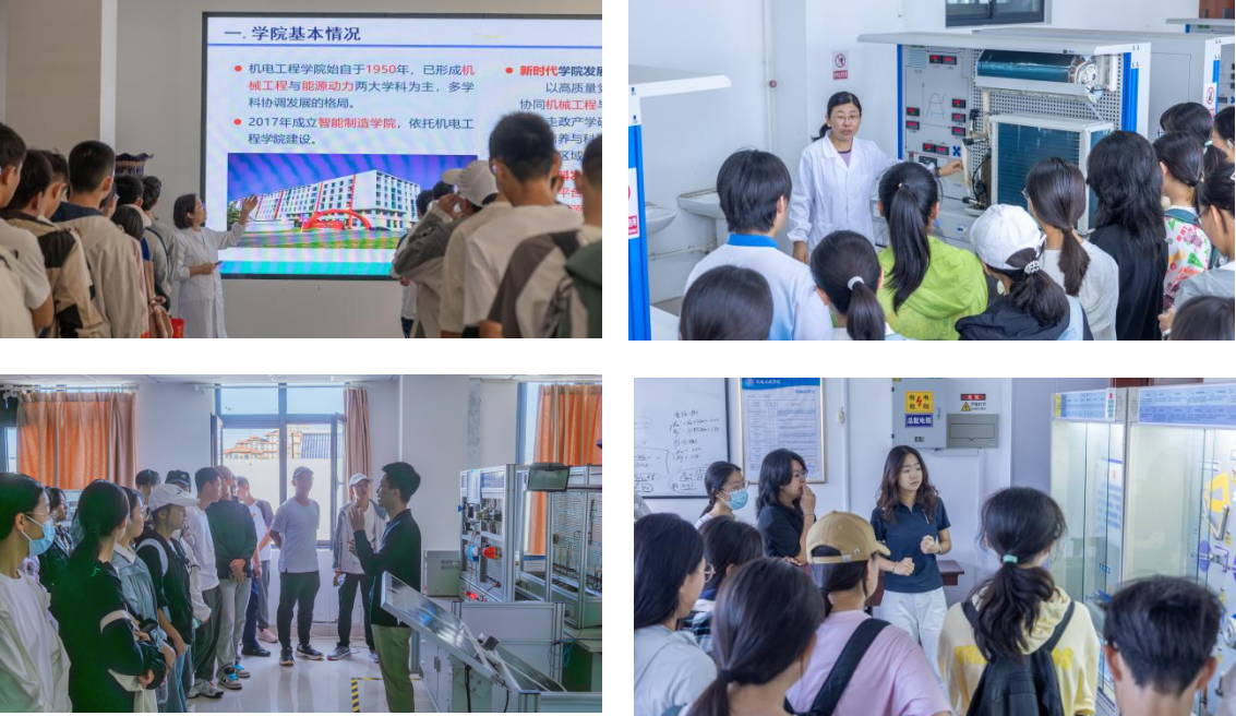 本次活动分为“学业发展指导”和“专业实验室研学”两大板块。学院机械基础实验中心教师白杨向研学学生系统介绍了学院的办学历史、学科专业布局、人才培养特色以及在智能制造、新能源装备等领域的科研成果,为学生搭建起专业认知的“全景框架”。在实验室研学环节,学院专业教师团队带领研学学生深入机械原理实验室、能源与动力工程实验室。在机械原理实验室,教师通过陈列柜中的平面连杆机构、运动副模型,用通俗易懂的语言讲解机械设计的底层逻辑,让新生直观理解“复杂工程源于基础结构”的专业内涵;在能源与动力工程实验室,讲解教师围绕制冷机组实验设备,拆解空调、制冷系统的工作原理,将热力学理论转化为可观察、可感知的生活实例,极大激发了新生的探究兴趣。