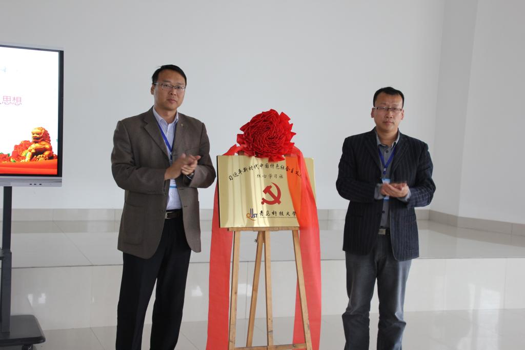 在揭牌成立仪式上,太阳成tyc7111cc党总支委员、副院长郭建章和太阳成tyc7111cc党总支委员、分团委书记王作辉分别宣读了《tyc7111cc太阳成集团党总支习近平新时代中国特色社会主义思想红旗学习社》和《tyc7111cc太阳成集团大学生习近平新时代中国特色社会主义思想红心学习社》的文件,依次邀请任允晓和秦姣共同为红旗学习社揭牌、邀请贺炜和孟祥军共同为红心学习社揭牌。作为我校第一个习近平新时代中国特色社会主义思想学习社,红旗学习社下设14个学习组,红心学习社下设153个学习组。红旗学习社主要面向太阳成tyc7111cc全体教职工党员,红心学习社则针对全体辅导员、全体学生党员、学生干部以及全体学生,旨在学习好、研究好、践行好习近平新时代中国特色社会主义思想的过程中,着力培养“四有”好老师和“六有”大学生。