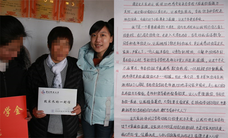 走访结束后,受访家长和学生以电话、微信以及书信等多种途径,向学校和学院的领导和老师们表达了感激与感谢。他们纷纷表示,家访这种“面对面”的情感沟通,使他们不仅感受到学校将党和国家的资助政策落到了实处,而且拉近了学生、家长、教师和学校四者之间的距离。希望在学校和学院精准扶贫的助力下,共同携手把担当民族复兴大任的时代新人呵护好、教育好、培养好,早日感恩父母、报答母校、回馈社会。