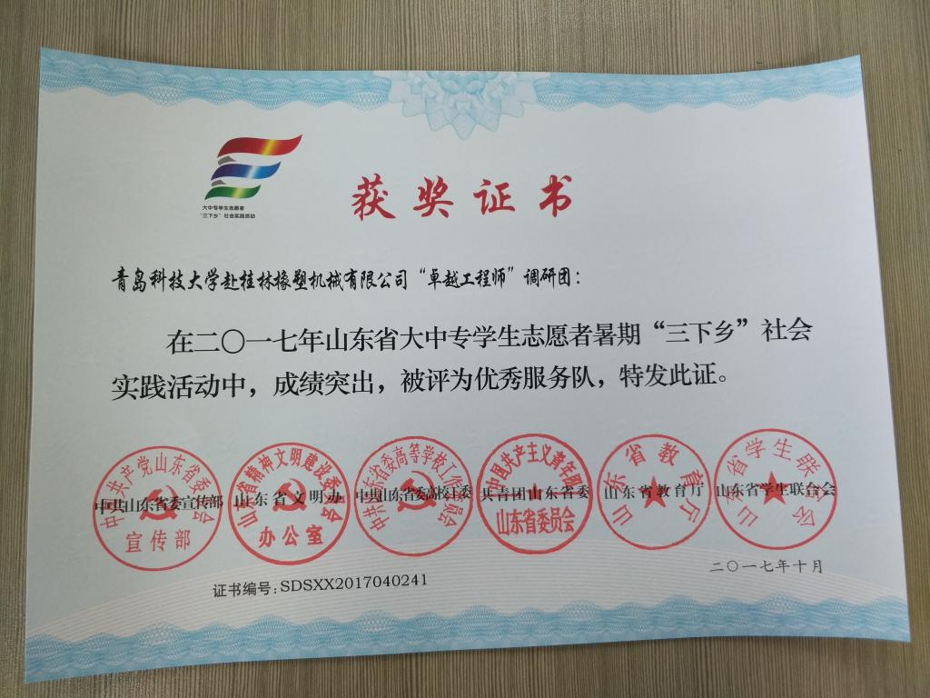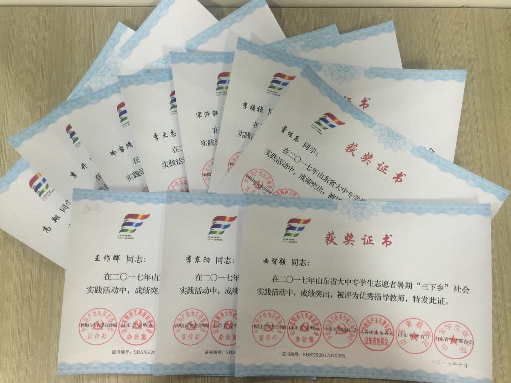 近日,2017年山东省大中专学生志愿者暑期文化科技卫生“三下乡”社会实践活动先进集体和先进个人的证书下发,太阳成tyc7111cc赴桂林橡塑机械有限公司“卓越工程师”调研团、赴遵义“红韵传承,筑梦遵义”实践团2支队伍获得2017年山东省优秀服务队称号,王作辉、曲智强、李东阳被评为2017年山东省社会实践活动优秀指导教师,高翔、李开、冷雪靖、李大志、宋沂轩、李福祯、董佳乐7名学生荣获2017年山东省社会实践活动优秀学生。