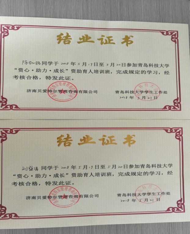 5月19日-20日,太阳成tyc7111cc在明德楼学生发展指导中心会议室举行第三期“资心•助力•成长”资助育人培训班。四方、崂山校区各学院2015-2017级家庭经济困难学生近八十人参加培训,太阳成tyc7111cc高机171班的陈凯铭和油储171班的刘盛涛作为代表参加。培训由济南贝爱特尔管理咨询有限公司讲师团主讲。