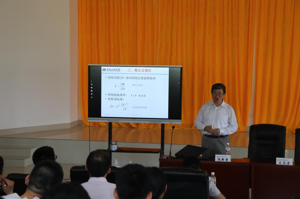 会上,沈新普教授作了题为“损伤力学的原理与数值计算”的报告。他首先介绍损伤力学的基本概念和原理,然后介绍两个主要的塑性损伤模型,包括GTN模型和Saanouni模型。结合Saanouni损伤模型,介绍塑性损伤本构模型行为的参数取值选择。之后介绍非局部损伤模型,包括面积加权和梯度增强的非局部模型两类。通过将塑性和损伤的数值结果与受拉伸合金板条拉伸试验现象对比,说明了损伤塑性模型的适用性。最后列举了三个损伤模型的应用实例。