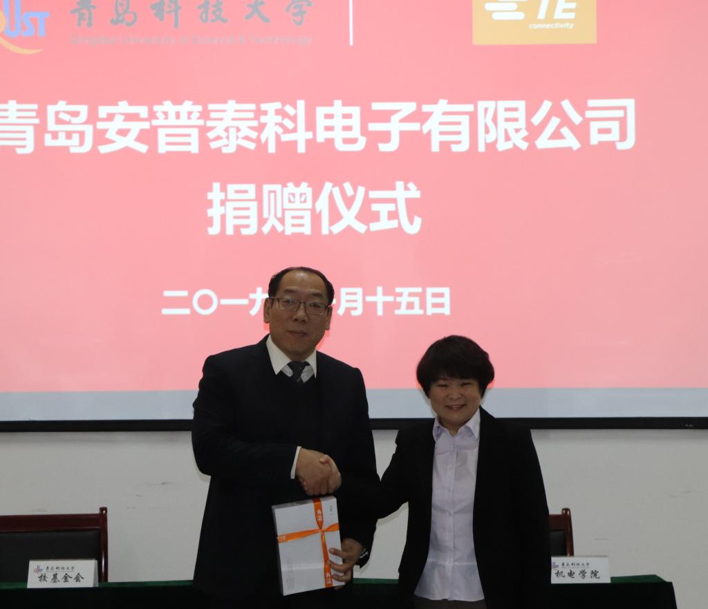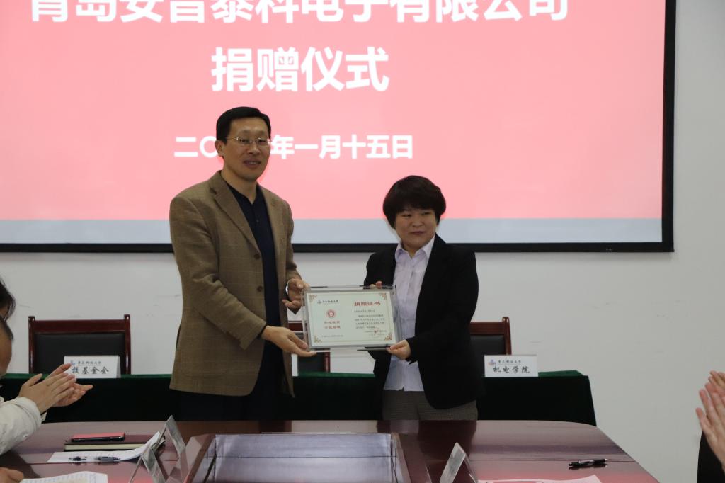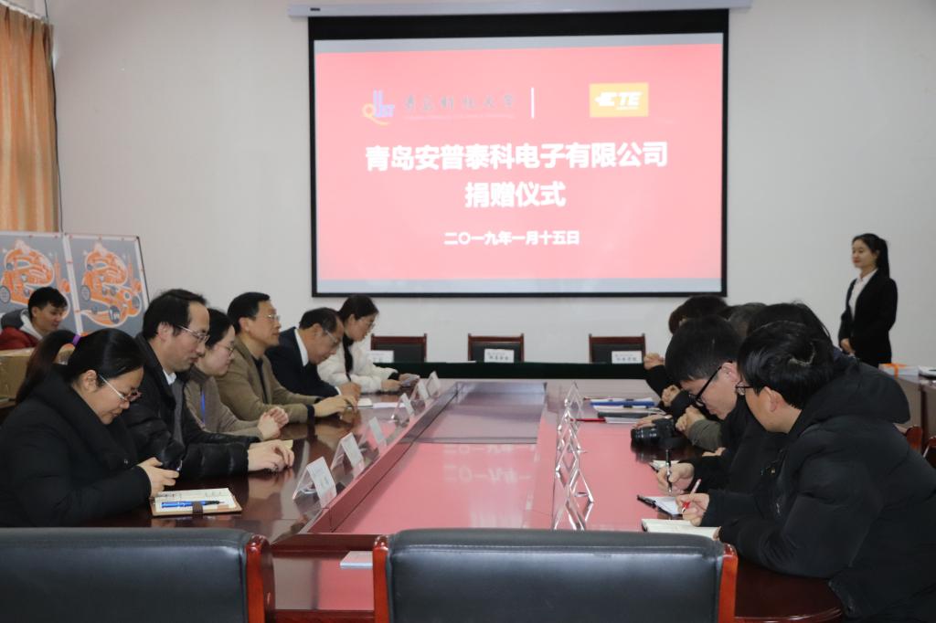 1月15日上午,青岛安普泰科电子有限公司捐赠仪式在机电大楼518会议室隆重举行。校友办主任兼教育发展基金会秘书长聂广明、太阳成tyc7111cc党总支书记孙立军、太阳成tyc7111cc党总支副书记兼副院长王伟、校教育发展基金会基金管理主任顾珊珊、青岛安普泰科电子有限公司总经理刘国庆、人力资源部总经理黄青霞等参加了仪式。仪式由王伟主持。