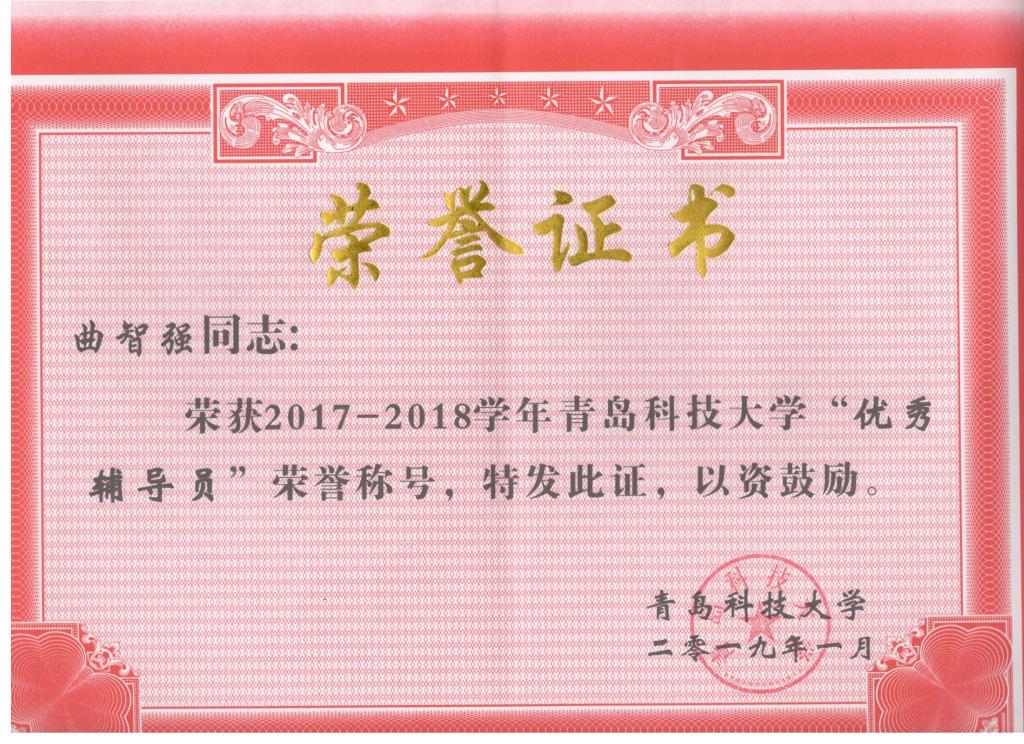 近日,在学校公布了2017-2018学年太阳成tyc7111cc优秀辅导员名单,太阳成tyc7111cc曲智强老师荣获校优秀辅导员。