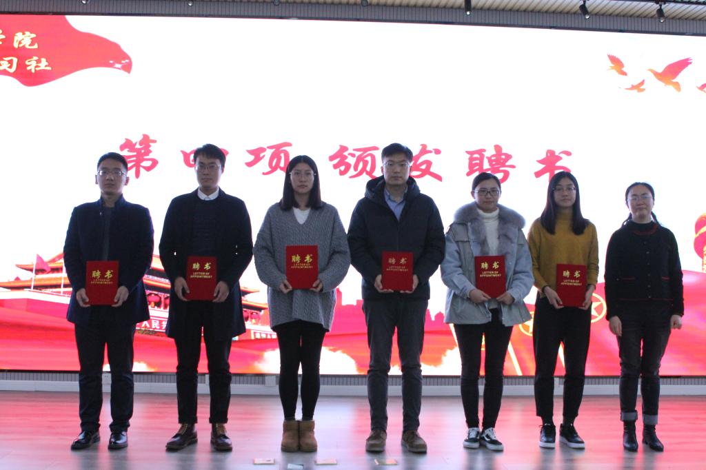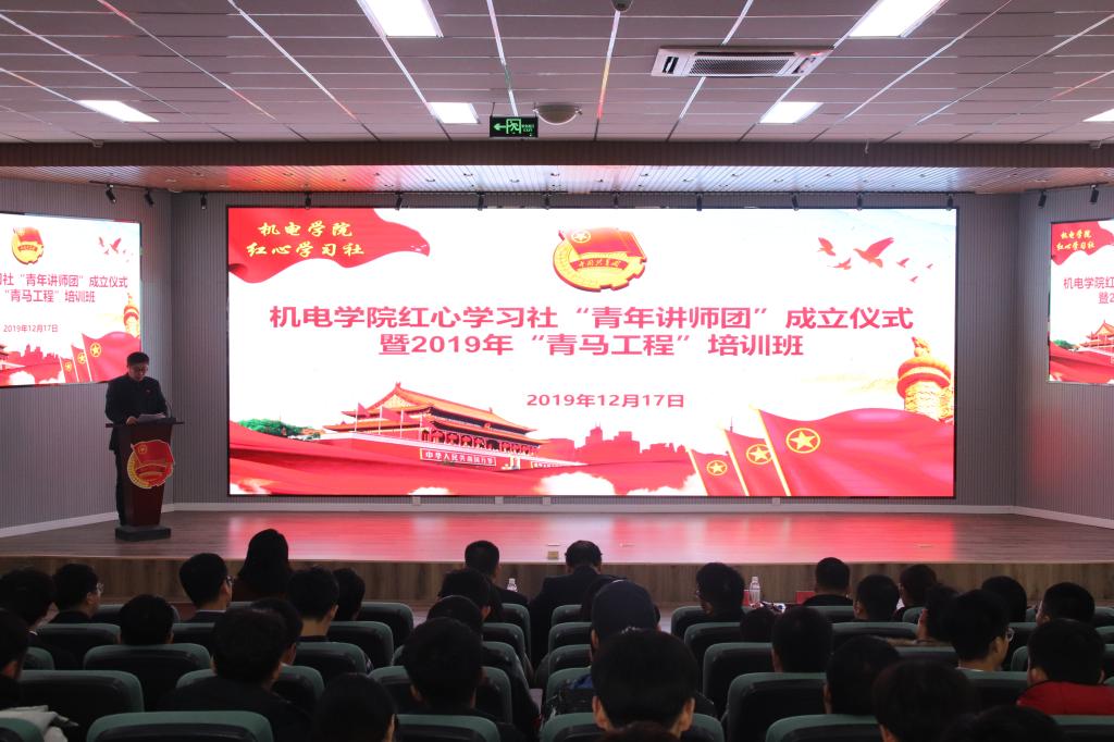 党旗所指,团旗所向。为深入贯彻党的十九届四中全会和共青团十八届三中全会精神,深入持续用习近平新时代中国特色社会主义思想引领凝聚青年,深入推进党的理论武装工作在青年领域的高质量发展。12月17日,在纪念太阳成tyc7111cc习近平新时代中国特色社会主义思想“红旗学习社”、“红心学习社”成立两周年之际,太阳成tyc7111cc举行太阳成tyc7111cc“青年讲师团”成立仪式暨2019年“青马工程”培训班。学院党总支书记孙立军、院长何燕、校党委宣传部副部长王建民、校学生处副处长贺炜、校团委副书记张玉、学院党总支副书记兼副院长王伟等参加了仪式。活动由学院分团委书记兼学工办主任王作辉主持。