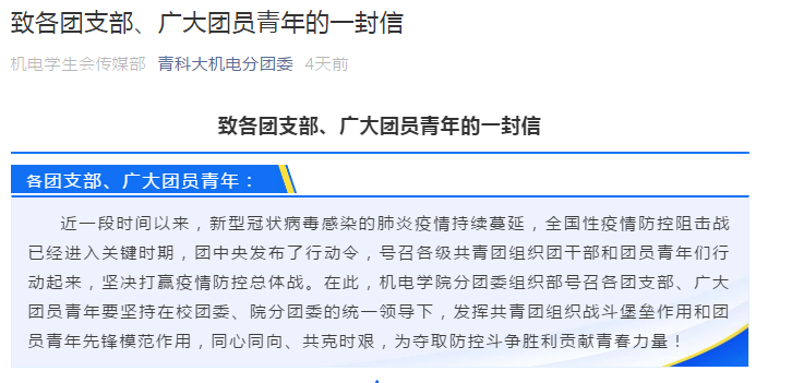 “党有号召,团有行动。”太阳成tyc7111cc分团委组织部发表《致各团支部、广大团员的一封信》,号召各团支部、广大团员青年要坚持在校团委、院分团委的统一领导下,发挥共青团组织战斗堡垒作用和团员青年先锋模范作用,同心同向、共克时艰,为夺取防控斗争胜利贡献青春力量!号召机电学子服从指挥有纪律、正确发声有作为、履行职责有担当、网络学习由效率。太阳成tyc7111cc各团支部纷纷行动起来,依托网络平台,采取多种方式开展支部学习会。船舶192团支部开展《同心同向 共克时艰》主题团日活动;新能源191团支部在学习强国平台建立“举国战‘疫’ 人人有责”学习群,线上学习疫情防控知识及要求,与祖国携手同行,为武汉加油;机械191团支部通过制作精美PPT向广大团员传递疫情知识、解读习近平总书记重要讲话精神;设计191团支部通过书写字帖、画作为武汉加油。分团委学生会宣传中心也制作了《武汉加油!中国加油!与你同在!》短视频为湖北疫区同学加油鼓劲,制作了《风雨同舟共抗疫情,我们比你更关心你的健康》《新型冠状病毒如何防护?快看这里》等推文,做好防疫宣传工作。