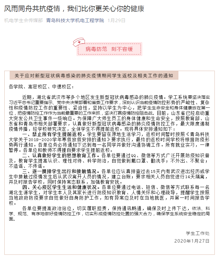 “都是我们的亲学生,关键时刻我们都是义不容辞的加以关怀。”在疫情暴发的时刻,学院成立了疫情防控小组,按照职责分工,依法依规有序推进疫情防控工作,严格执行“日报告、零报告”制度,精确摸排掌握易感师生群体,密切追踪并随时掌握广大师生员工的健康状况。学工队伍每日对37名湖北籍及途经湖北的学生进行密切跟踪,并做好人文关怀、心理疏导,确保每一位机电学子都平安健康。为了“停课不停教、停课不停学”,不影响每一个学子的学习生活,各系老师纷纷主动运用线上教学优势,学习线上教学,保证学生需求。面临就业季,带毕业生的老师也开始线上对即将毕业同学开展一对一就业辅导、发布就业信息,在线帮助同学完善修改简历、不断推进高端就业。通过开展在线心理咨询辅导,为学生开展远程心理援助。