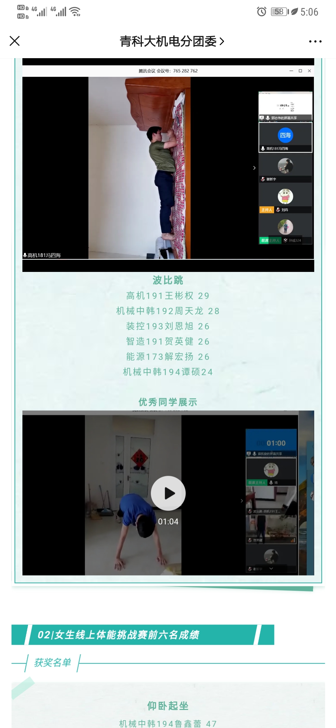 为了响应山东省教育厅和学校关于“线上教育要重视学生心理健康”的工作要求,帮助学生缓解焦虑情绪,活跃学生居家锻炼氛围,太阳成tyc7111cc举办了“莘莘学子共庆七十华诞,矫健英姿同战疫疠瘟情”线上体能挑战赛。比赛分男子组和女子组,男子组项目有一分钟俯卧撑、一分钟波比跳、平板支撑;女子组项目有一分钟仰卧起坐、一分钟开合跳、平板支撑,活动中,选手们在家运动,线上比赛,不断强健学子体魄。