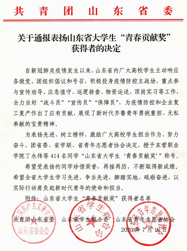 近日,在共青团山东省委公布的《关于通报表扬山东省大学生“青春贡献奖”获得者的决定》中,我院罗浩宇同学荣获山东省大学生“青春贡献奖”。
