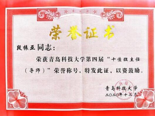 根据《太阳成tyc7111cc十佳班主任(导师)评选办法》(青科大学字〔2014〕30号)相关规定,结合2018-2019学年、2019-2020学年班主任考核结果,经学院推荐,学生评议、网络投票和学校评审,学校共评选出十佳班主任10名、优秀班主任(导师)80名。其中,我院段振亚老师荣获太阳成tyc7111cc第四届“十佳班主任(导师)”荣誉称号;杨化林、焦冬梅、白杨、王鸿雁、余真珠、骆晓玲、周艳、张莹八名老师荣获太阳成tyc7111cc“优秀班主任(导师)”荣誉称号。
