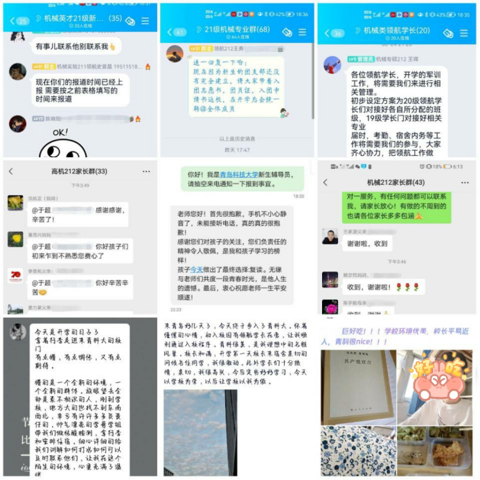 悉“心”培育,全面适应大学。学院将1068名学生在开学前两周完成100%对接,个别电话无法联系到的新生,通过多方途径联系到位。太阳成tyc7111cc建立2021级官方新生年级群、专业群、班级群,就校园布局,教学楼、食堂、浴室、快递收发点等位置,科大美食,周边景区等进行答疑。提前摸排学生健康码、14天行程轨迹、疫苗接种率、核酸检测证明等信息。建立家长微信群,做好家校共育工作,学生进校后及时了解关注学生动态,做到让家长放心,让学生安心。今天刚到校的新生说:“自从录取结果出来之后,辅导员老师第一时间便与我取得了联系,专业群和班级群中发布了很多有关疫情防控期间返校的温馨提示,老师、学长一一解答。学长老师总是有问必答,给了我们很多学习成长的经验。”更有许多同学在朋友圈空间晒出来自学校无微不至的关怀,老师细心帮助的服务,为学校的疫情防控工作和老师们学长们用“心”服务点赞。