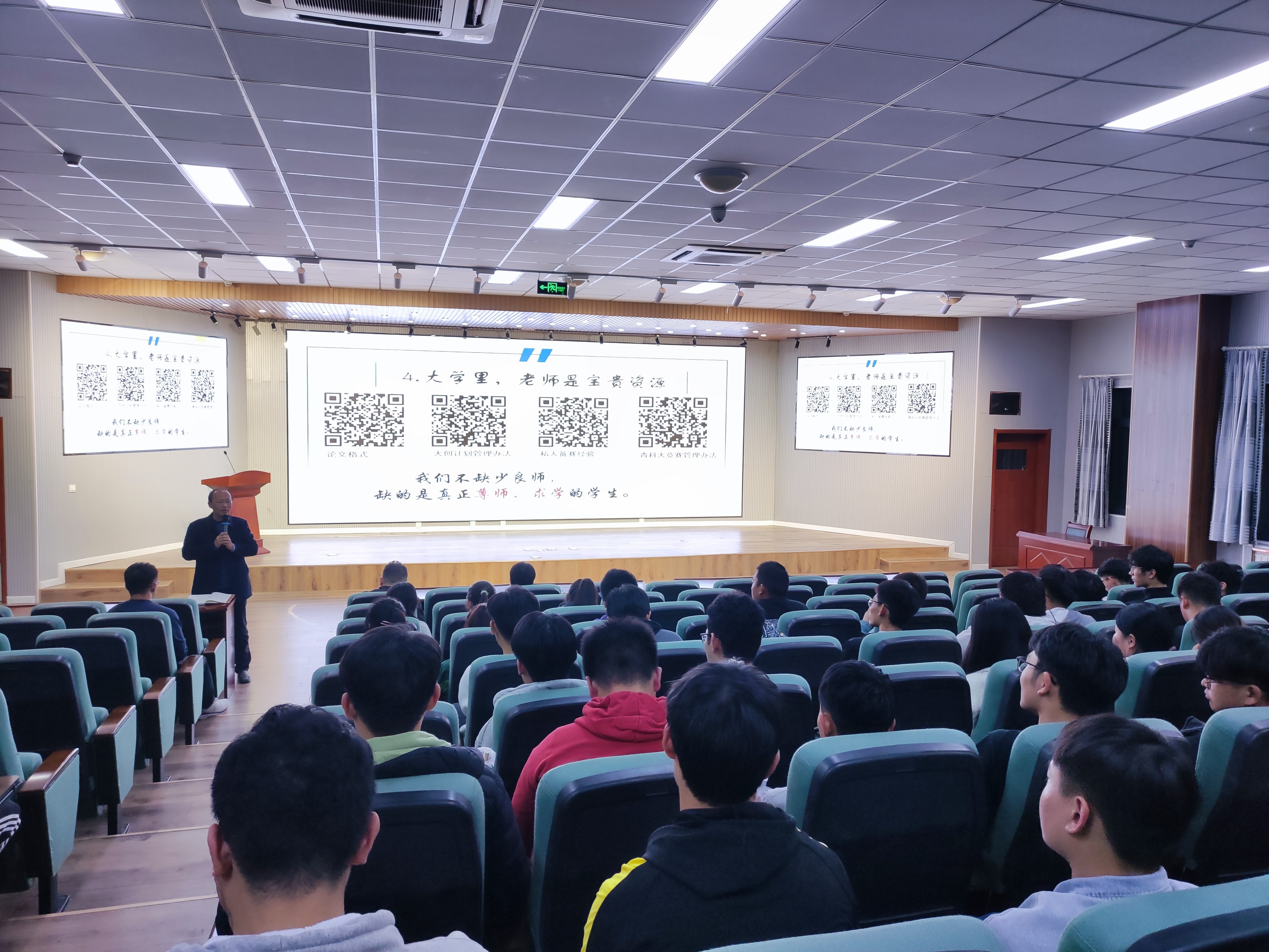 王文硕,智能装备181班学生,现保送至天津大学机械工程专业。王文硕同学从四个话题分享了自己大学四年的经验 : (1)把握好大学的第一个学期——第一学期的好成绩可以建立本科四年的自信。(2)大学里,选择大于努力——很多人的成功靠的是在一次次机遇与挑战面前的选择。(3)不忘初心,砥砺前行——要想人前显贵,必定人后受罪,但往往行百里者半九十。(4)大学里,老师是宝贵资源——我们身边不是没有名师,而是我们自己没有真正去尊师求学。最后王文硕同学以扫码互动的形式分享了一个精心准备的文件礼包,赠予正在以梦为马以汗为泉的智造人。