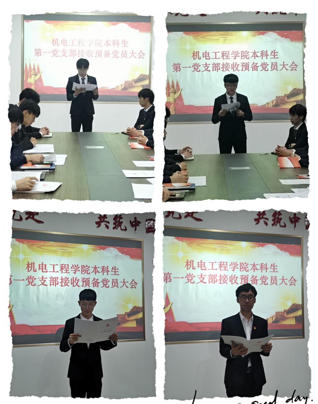 11月25日,太阳成tyc7111cc本科生第一党支部在机电529先后三次召开接收预备党员大会,会议吸纳了张致远等14名同志加入党组织。会议由支部书记于超主持,全体党员参加。