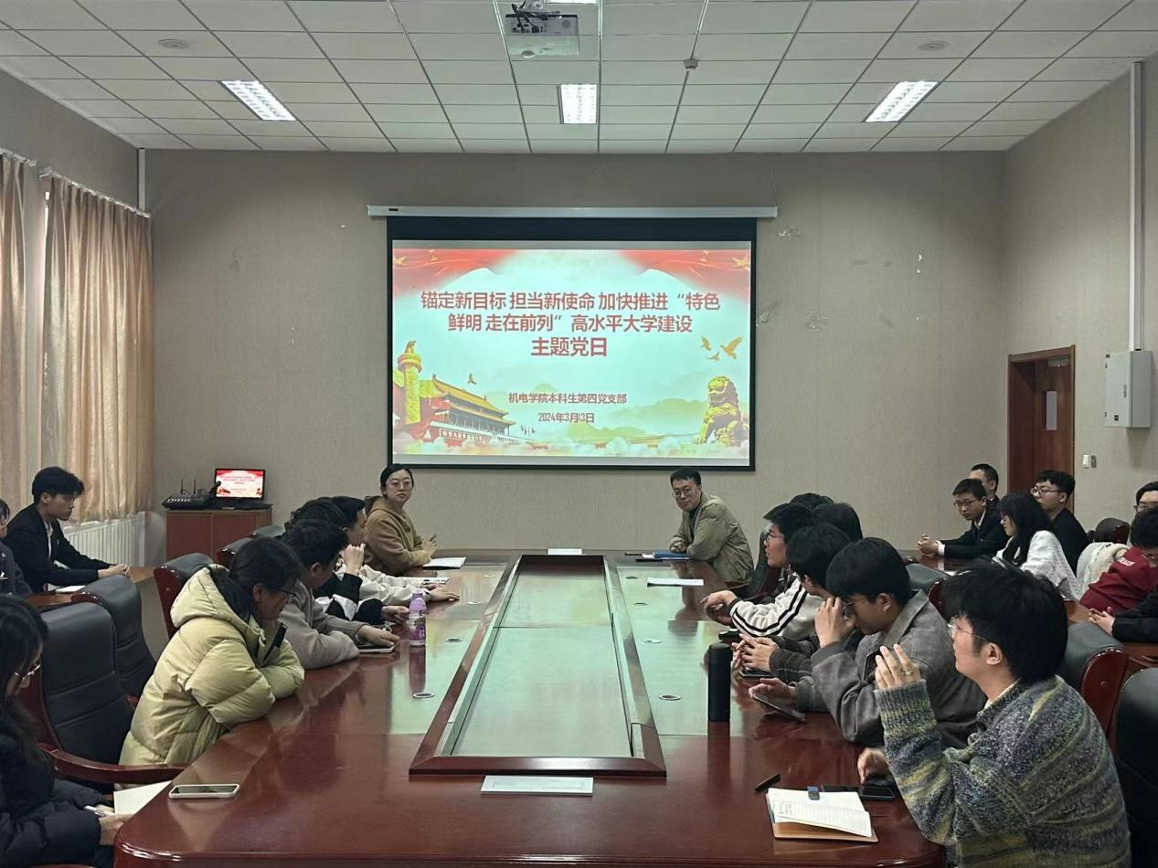 3月13日,tyc7111cc太阳成集团本科生第四党支部召开“锚定新目标,担当新使命,加快推进‘特色鲜明、走在前列’高水平大学建设”主题党日活动。