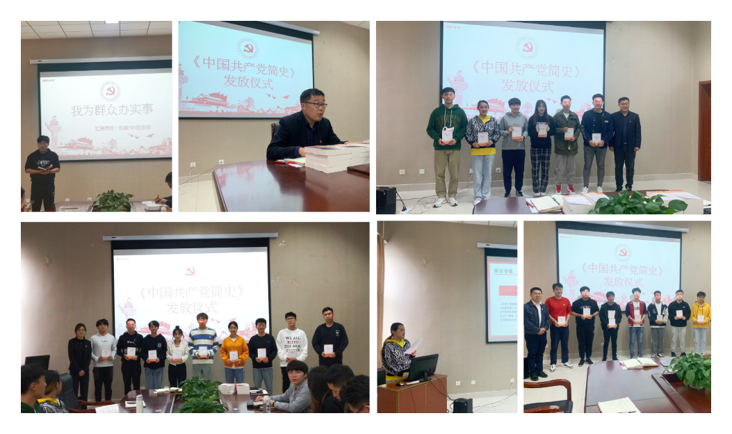 落实党史学习教育。支部书记王作辉、副书记李慧敏、胡福超三位教工党员为全体学生党员发放了《中国共产党简史》,鼓励学生党员积极深入的学习党史,落实党史学习教育的要求。