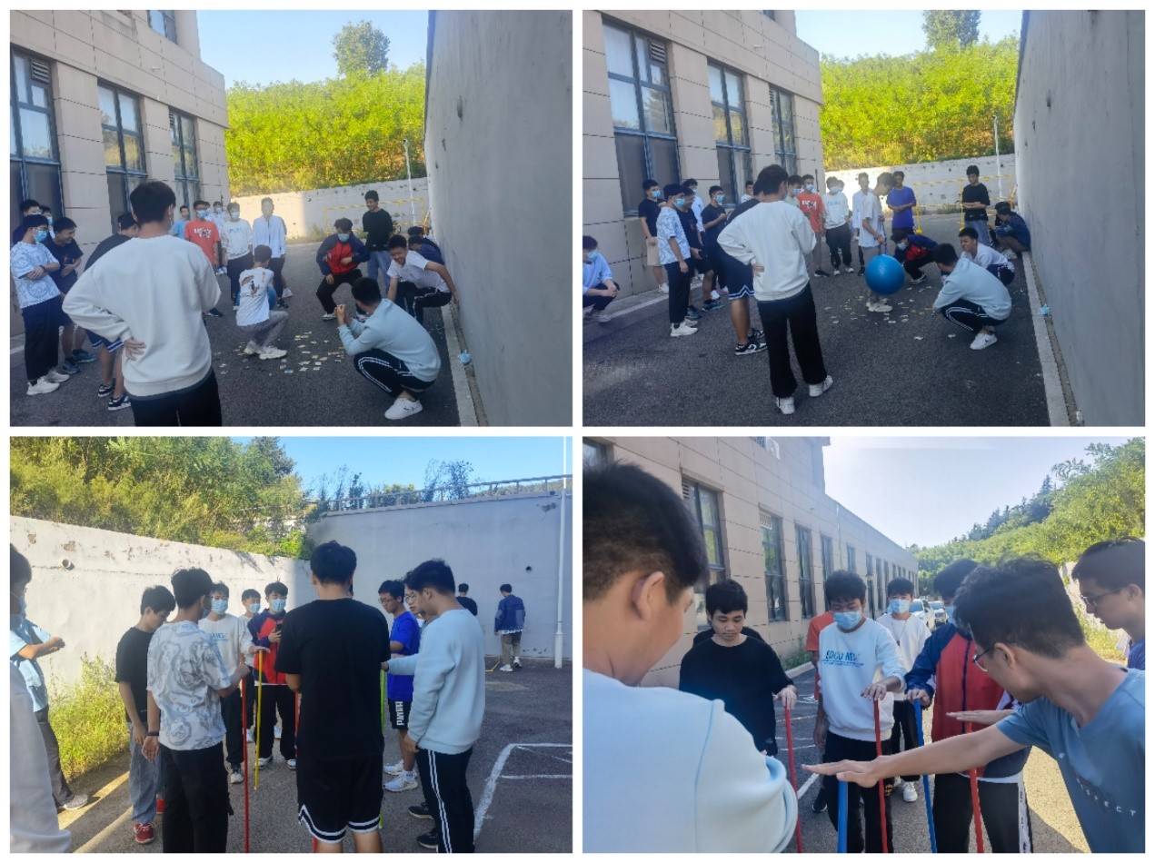此次活动设置了躲避大摆球、扶棍子、“穿越电网”和投壶以及解手结五个项目。活动人员均分为三队,依次进行活动项目,首先开始第一个项目----躲避大摆球,中间站立一人旋转气球,各队全体成员参加,负重争夺卡片,被气球击中则淘汰,30秒内争夺卡片多的队伍获胜。随后开展了扶棍子项目,全队成员围一圈扶右边队友的棍子,坚持时间长的队伍获胜。各队队员间配合默契,其乐融融,展现了良好地精神风貌。