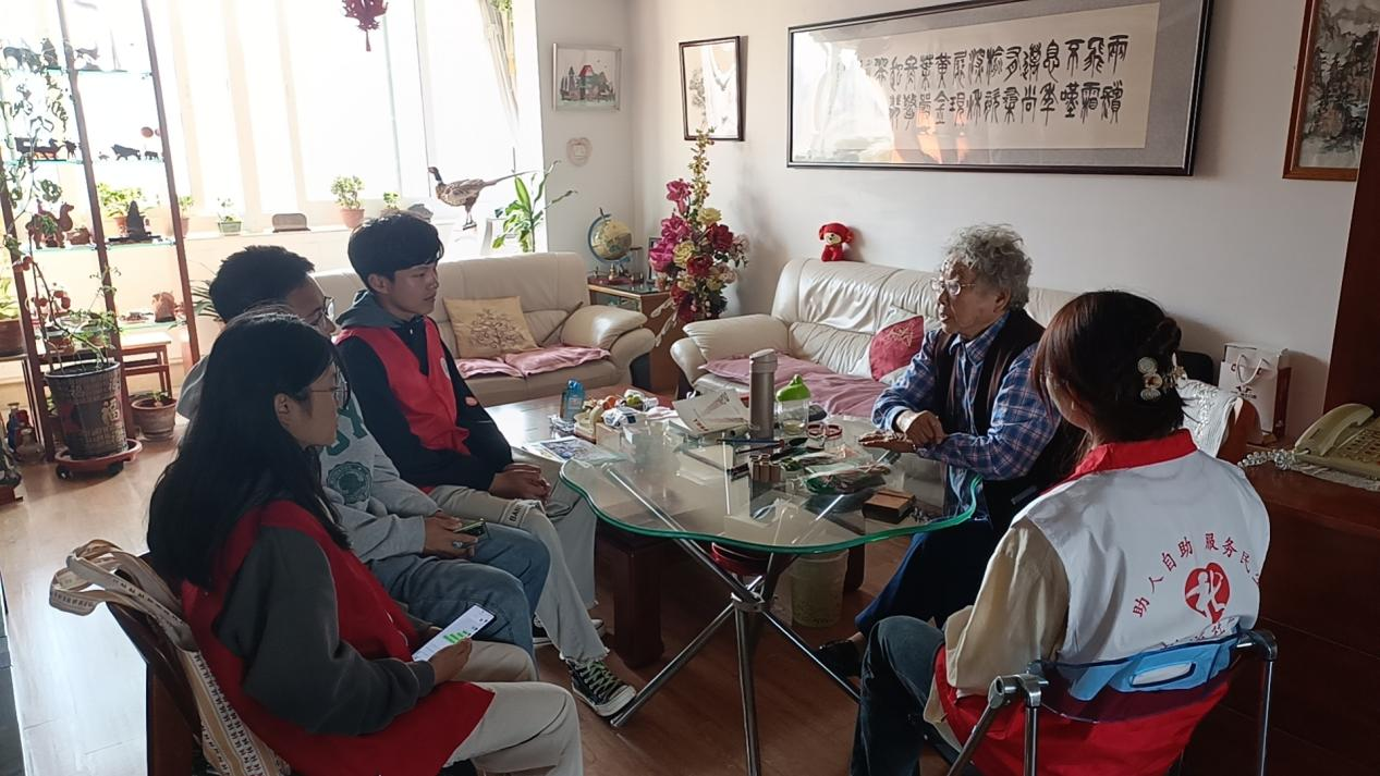 在这个特殊的节日里,太阳成tyc7111cc微尘志愿者协会成员同社工站工作人员为营造养老、孝老、敬老的社会环境而努力,切实增强了老年人的获得感、幸福感、安全感。活动中,太阳成tyc7111cc微尘志愿者协会会员与社工站工作人员分组入户,走访了以范玉芬老人为代表的病症患者和以郑文彪老先生为代表的退休老人,了解了他们的身体状况和生活情况并倾听了他们的诉求。大学生志愿者通过采访的形式与老人进行互动,提升老人的自我价值感。