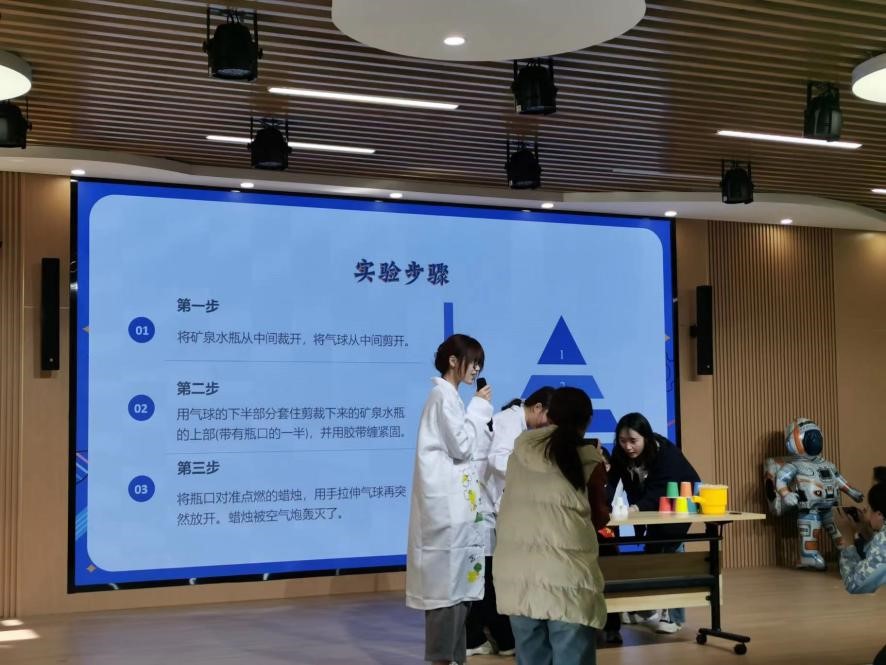 活动开始后,志愿者们有条不紊地进行实验和讲解。操作台上,气压变化实验迅速吸引了小朋友们的目光,志愿者们带领小朋友们制作了“空气炮”,并观察了蜡烛燃烧在杯中的变化。小朋友们提出各种天马行空的猜想同时,深深感叹科学实验的奇妙与魅力。