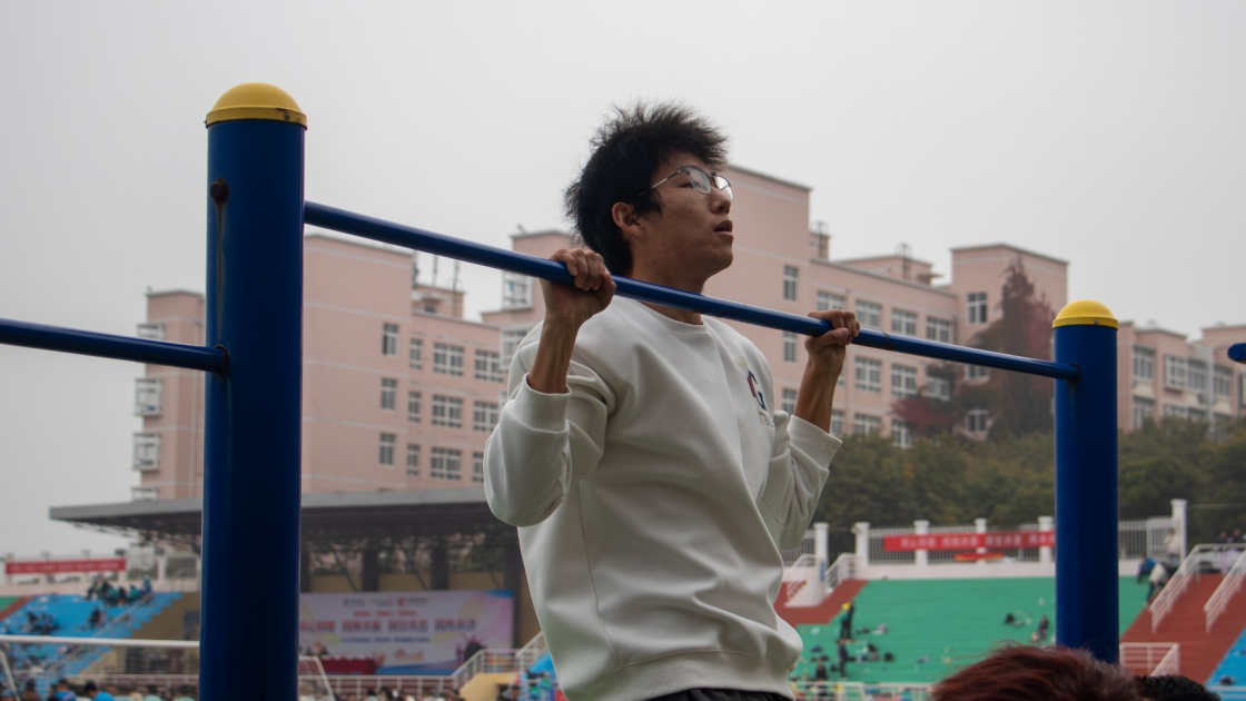 引体向上——力量与技巧的舞台。选手紧握单杠,凭借着上肢力量和毅力将身体一次次向上拉起。每次向上都是自我超越,如空中勇士展现青春的矫健与果敢。