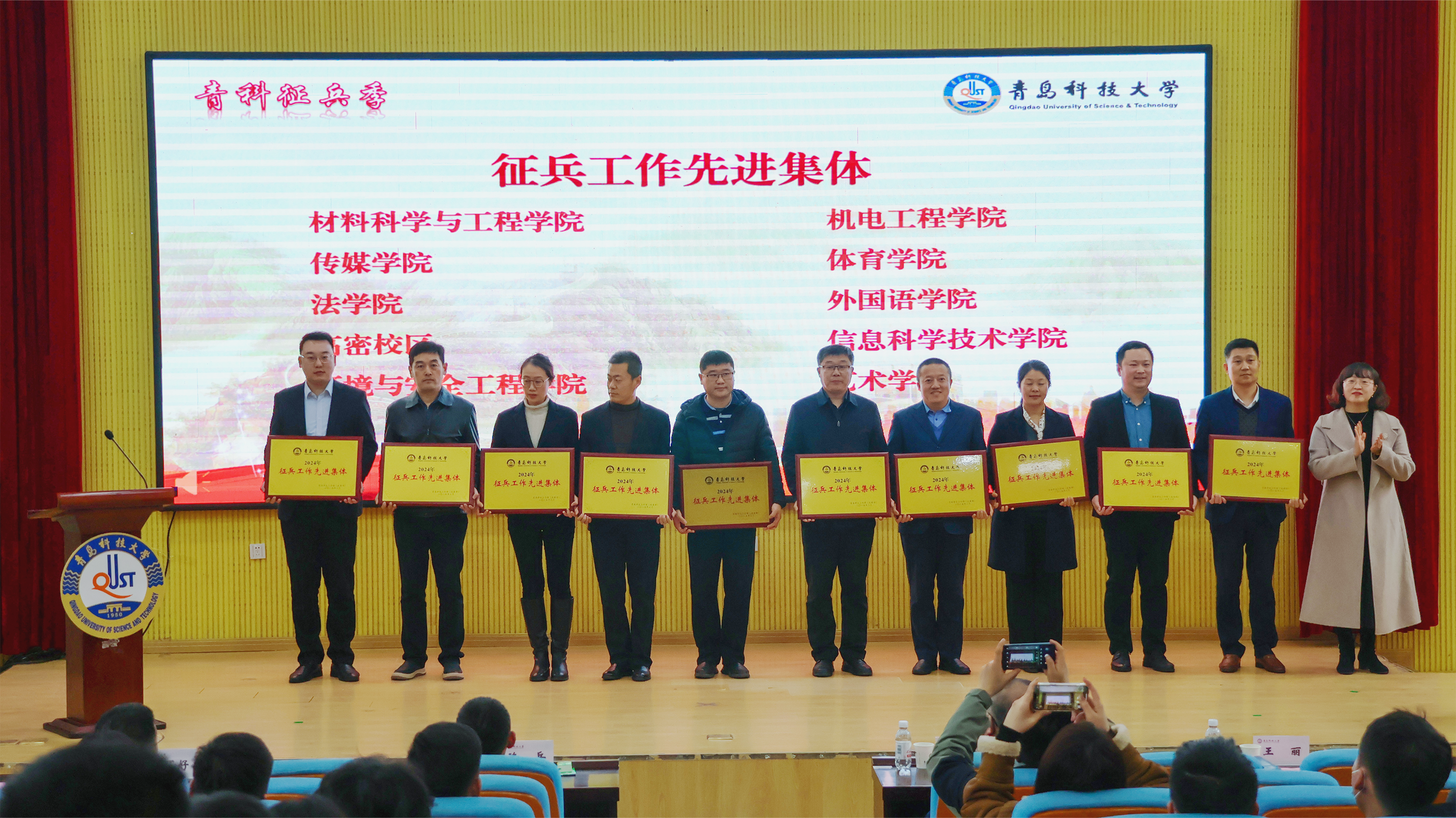 青春热血赴军营,强军报国正当时。3月11日下午,学校2025年春季参军入伍学生欢送会暨第二届“淬炼青春 筑梦国防”国防教育文化季启动仪式。在四方校区讲学厅举行。青岛市市北区征兵办主任、市北区人民武装部部长陈兵,学校党委常委、副校长丁林出席仪式。