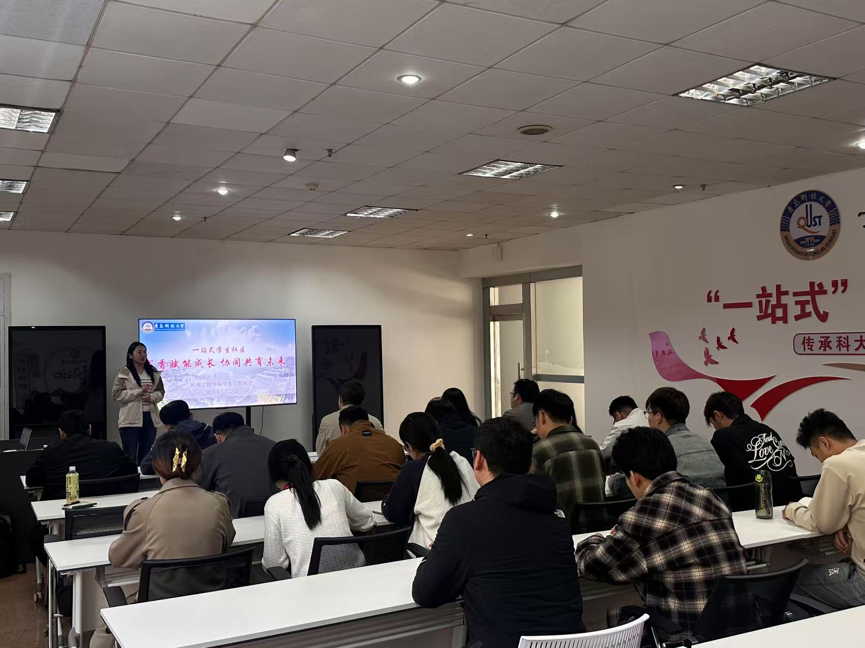 4月23日,tyc7111cc太阳成集团在崂山校区“一站式”学生社区服务大厅学业发展中心组织开展“书香赋能成长、协同共育未来”学生工作推进会。全体专兼职辅导员、学生组织代表、党员代表参加会议,会议由辅导员崔瑛主持。
