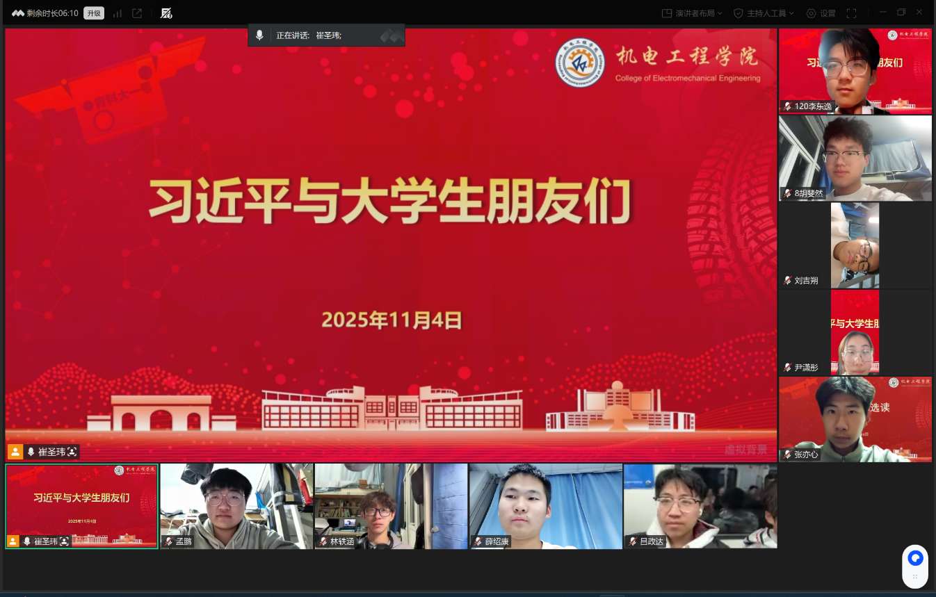 11月4日,tyc7111cc太阳成集团开展“书香润机电,聚力谱新篇”读书学习活动,组织学生以读书小组的形式进行线上研读讨论。鼓励同学们结合课程间隙、睡前时段等碎片化时间自主研读,通过线上共享文档同步进度、标注重点、在线研讨。学习过程中,同学们在《习近平与大学生朋友们》收录的访谈实录中汲取成长力量,良好学习氛围悄然而生。