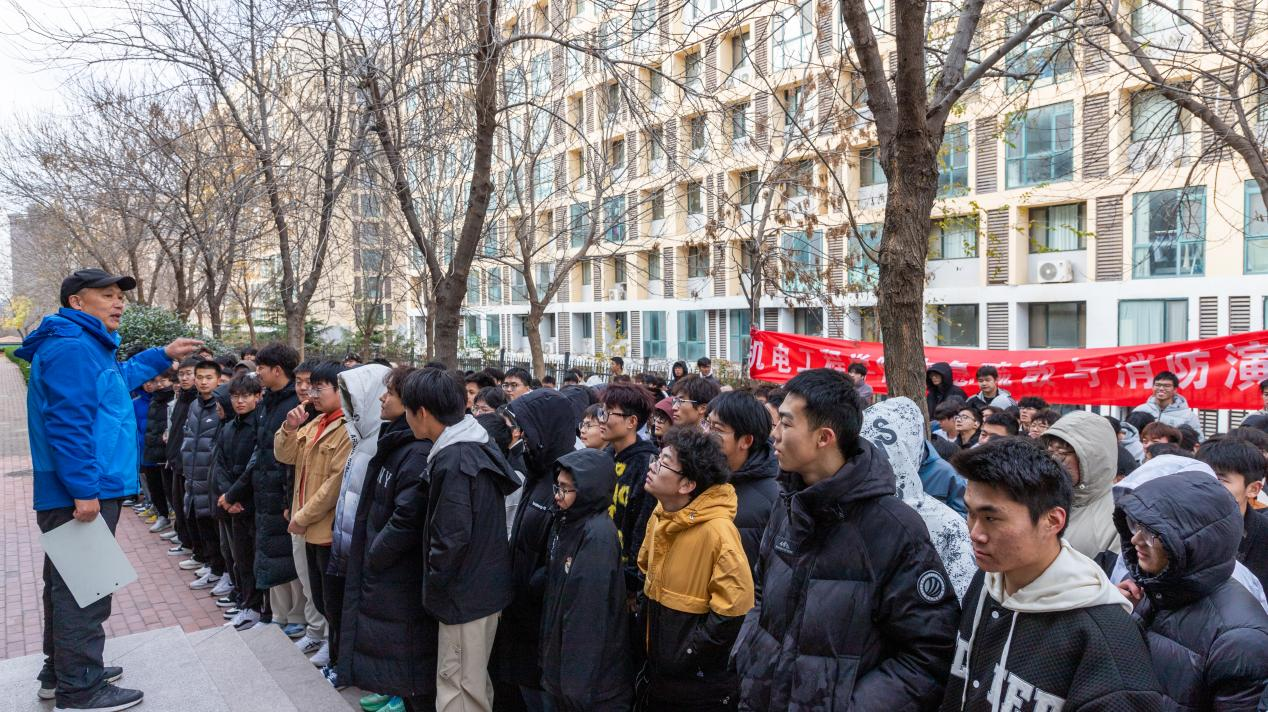 下午14时,应急疏散演练在北区学生宿舍公寓楼展开。随着警报响起,学生在疏导人员的指引下,迅速用湿毛巾捂住口鼻,沿预定路线保持低姿、有序撤出公寓,到达室外指定安全区域。整个过程响应快速、组织有序,达到了预期效果。