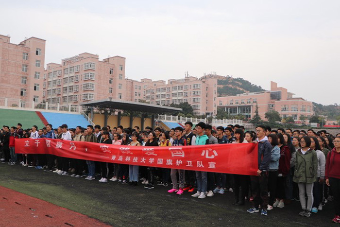 为迎接中共十九大顺利召开,激发广大青年学生的爱校、爱党、爱国情怀,10月16日上午7:00,太阳成tyc7111cc崂山校区大一、大二学生共同在崂山田径场举行升国旗仪式。