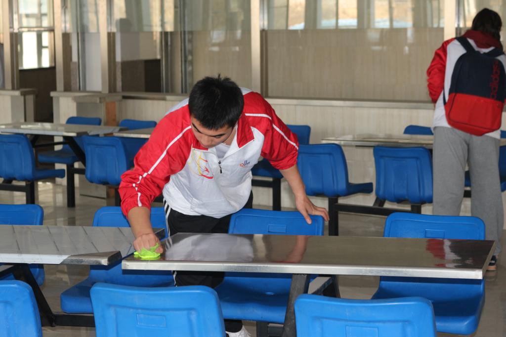 根据本次活动方案及分团委老师们的严密部署,全体志愿者分为两组进行义务清扫。一组负责擦洗桌椅,另一组负责清扫地面,尽管打扫过程很辛苦,但是同学们却热情饱满,做得十分用心,他们秉承着“学习雷锋,弘扬雷锋精神”的理念,不怕脏,不怕累,认真地清扫餐厅三楼的每个角落。通过近一个小时的艰辛劳动,北苑餐厅三楼的环境被干事们清理得干干净净。虽然辛苦,但志愿者们脸上的笑容却依然灿烂,透露出一种幸福的信息,尽管天气还有点寒冷,但是同学们的心里都暖洋洋的。新时代的雷锋精神在太阳成tyc7111cc学生会每个成员身上体现了出来。雷锋精神已深深融入到中华儿女建设祖国、奉献社会的热血中,更体现在了当代大学生助人为乐、无私奉献、全心全意为人民服务的活动中。