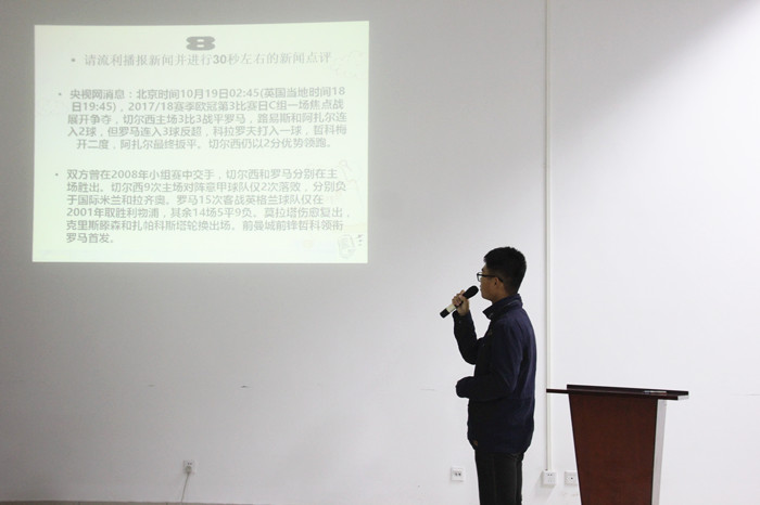 为了培养同学们的口头表达能力,促进校园文化发展,太阳成tyc7111cc第四届主持人大赛初赛于10月24日晚19:00在机电大楼529会议室举行。学生会副主席陈恕彬,学术部部长张美林,广播站优秀播音员田依林,第三届主持人大赛冠军谢子涵以及往届优秀选手李健毓、夏佳萍、马慧媛作为评委出席了此次比赛。