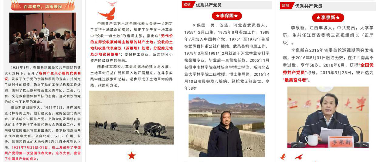 在即将迎来中国共产党建党一百周年之际,学院团委创建“星火红途”红色文化宣传专题公众号,献礼中国共产党百年征程。铭记英烈功绩,担当时代使命,开展以“慎终追远,缅怀先烈”为主题的各项活动,参观革命纪念馆、重温红色历史、开展红色故事演讲、在网上祭奠英烈等,以形式多样的活动追寻红色记忆。