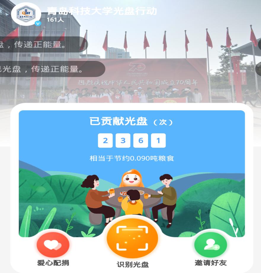 在10月16日至11月1日的两周时间里,青尘义工队的7组队员每次用餐后通过微信“光盘打卡”小程序扫描饭后的光盘,经由AI识别是否光盘并给予奖励,同时积极向身边的同学和家人宣传,呼吁他们加入光盘打卡的队列。截止2020年10月31日,累计光盘打卡2361次,相当于节约了0.090吨粮食,捐赠了1830万能量,为5240个孩子送去了一顿热腾腾的午餐。