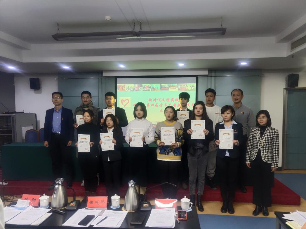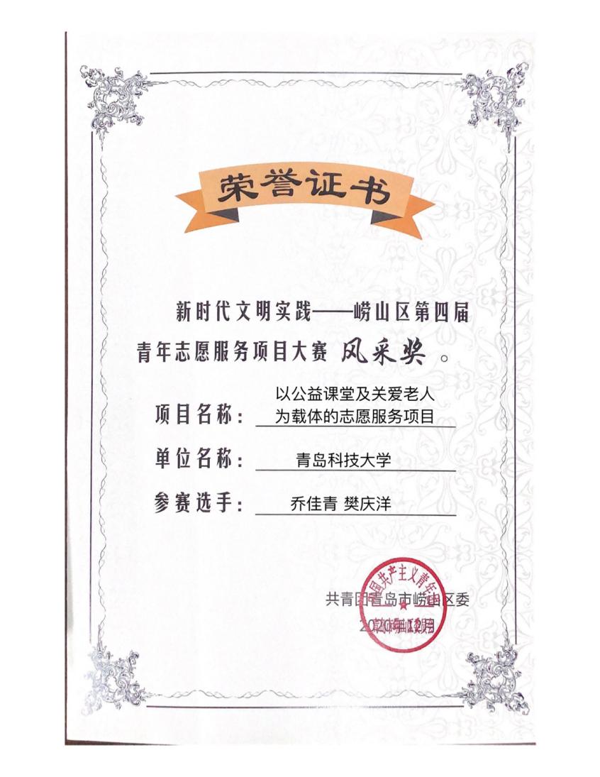 12月17日 ,由青岛市崂山区文明办、团区委和区青年志愿服务联盟联合举办的“新时代文明实践——崂山区第四届青年志愿服务项目大赛”顺利开展。tyc7111cc太阳成集团团委志工部部长胡福超老师带领学生代表乔佳青、樊庆洋,积极参与、认真准备,青尘义工队“以公益课堂及关爱老人为载体的志愿服务项目”经作品申报、资格筛选、项目展示、评审打分等环节,最终获得大赛风采奖。